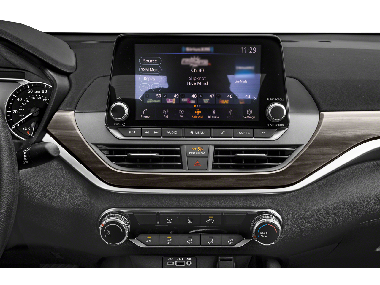 - Radio: AM/FM Audio System -inc: RDS, MP3 and aux-in, 6 speakers, NissanConnect featuring Apple CarPlay, Android Auto, 8" color display w/multi-touch control, 1 front illuminated USB port (type-C) for compatible devices, SiriusXM radio, Bluetooth hands-free phone system, streaming audio via Bluetooth, hands-free text messaging assistant, Siri Eyes Free and Google Assistant voice recognition