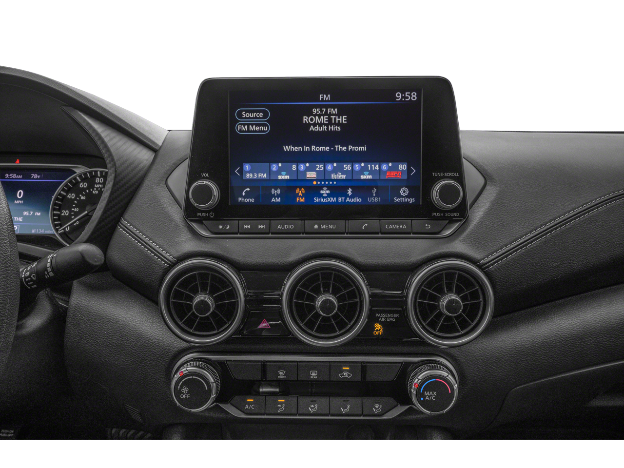 - Radio: AM/FM w/RDS/MP3/Aux-In -inc: 6 speakers plus 2 tweeters in A-pillar, 8" color display w/multi-touch control, streaming audio via Bluetooth, Bluetooth hands-free phone system, hands-free text messaging assistant, Siri Eyes Free, Google Assistant voice recognition w/Apple CarPlay and Android Auto, NissanConnect, (1) front USB connection port (type A), (1) additional front USB (type C), (1) charge-only USB (type A) center console and SiriusXM radio w/advanced audio features